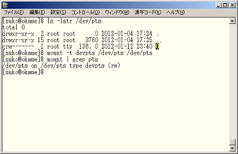 そりゃターミナル関係がおかしくなってるのかなぁ~なんて見てみたら/dev/ptsがマウントされてない。